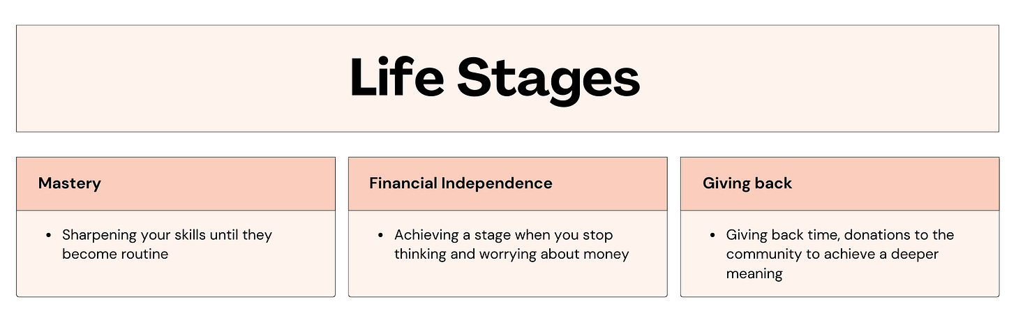 Of course, these are simplified examples. A manager might have two layers of meaning simultaneously (financial independence, mastery) or might never stop polishing a certain skill set, or might focus on achieving mastery in a totally new venture (changing careers).
