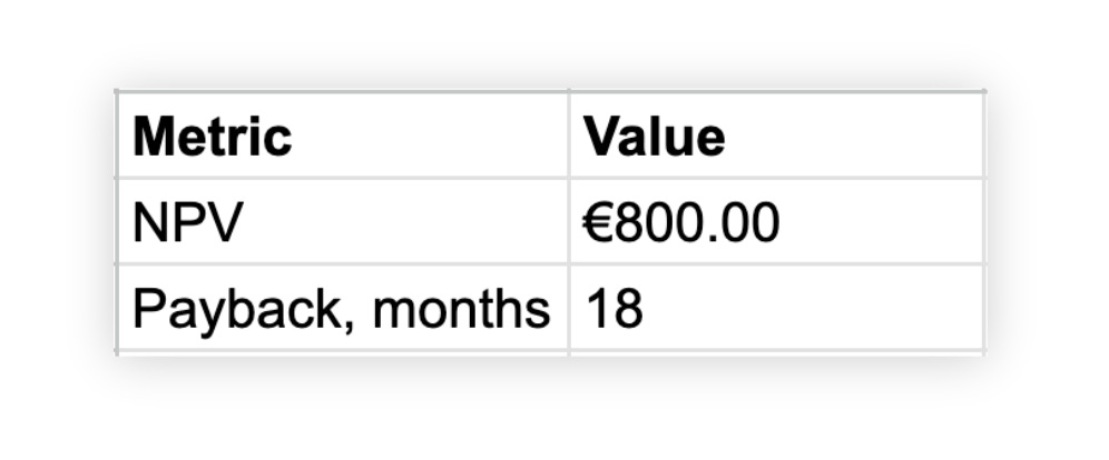 The two metrics above show that the business would yield a net profit of €800 (measured in today’s money) and will fully recover the invested money in 18 months. Everything beyond that period would be pure profit for the investor.