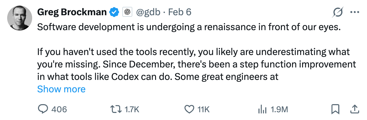 Greg Brockman in his recent X post said that “we’re undergoing a software renaissance”.