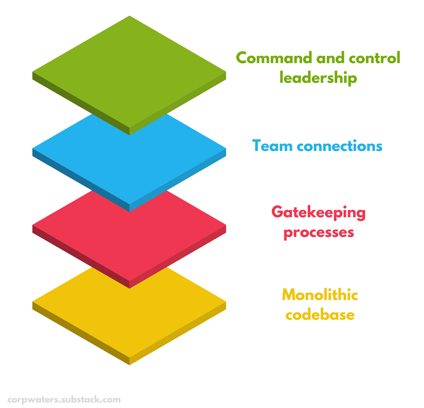 In cases of past hypergrowth, the entire product may have ended up with a monolithic codebase, making any quick changes practically impossible.